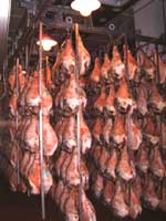 洗浄後、5〜7日間かけて乾燥させます。乾燥作業以降は、これまでの塩漬け用貯蔵庫と異なり庫内温度は15℃以上。対流式から吹き抜けに変わります。「カンティーナ(cantina)」と呼ばれる熟成庫で314日間熟成させられる間、生ハムから発せられる水分によって、相対湿度が2ヵ月半につき5%ずつ上がります。68〜80%に始まって、最大85%にまでなるそうです。 |